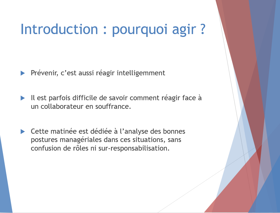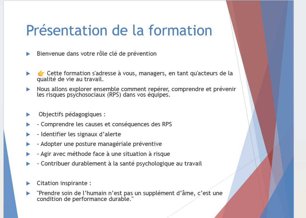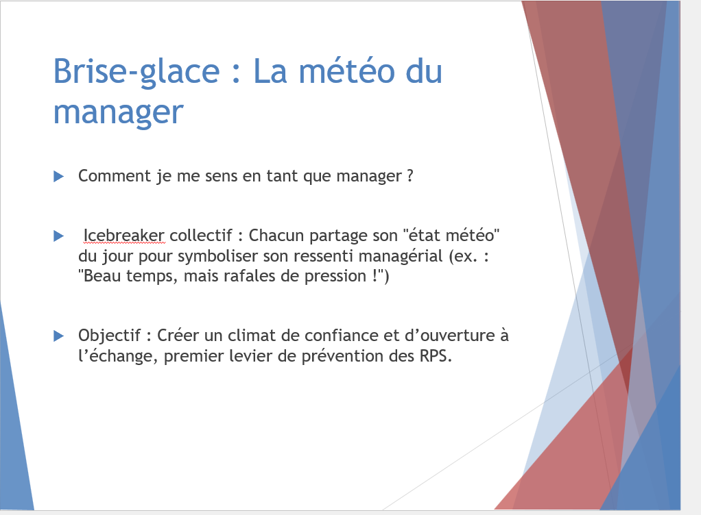 On y parle posture managériale, écoute sincère, reconnaissance, co-construction, et responsabilité partagée. On y vit aussi des mises en situation parfois touchantes, toujours formatrices. L’objectif ? Que chacun reparte avec des clés simples et puissantes pour prévenir les RPS au quotidien, tout en affirmant un leadership attentif et engagé.