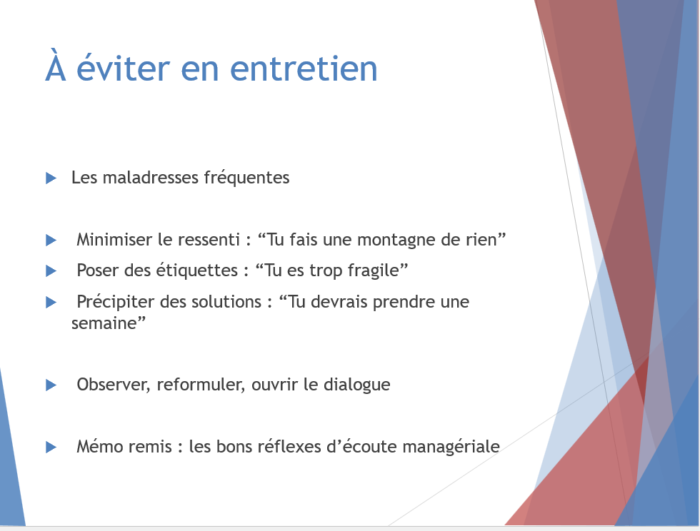 - Mise en situation : entretien avec un collaborateur en difficulté.