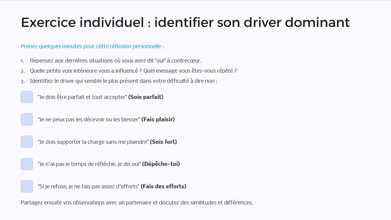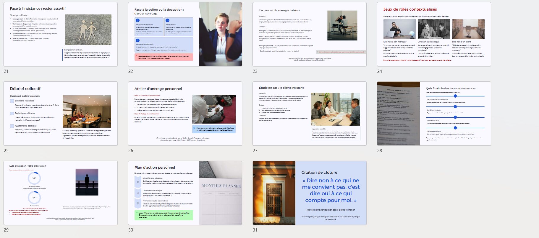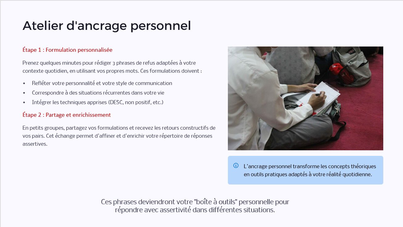 Jeux de rôles contextualisés (dire non à un manager, à un collègue, à un client) + un atelier d’ancrage avec rédaction de phrases personnalisées.