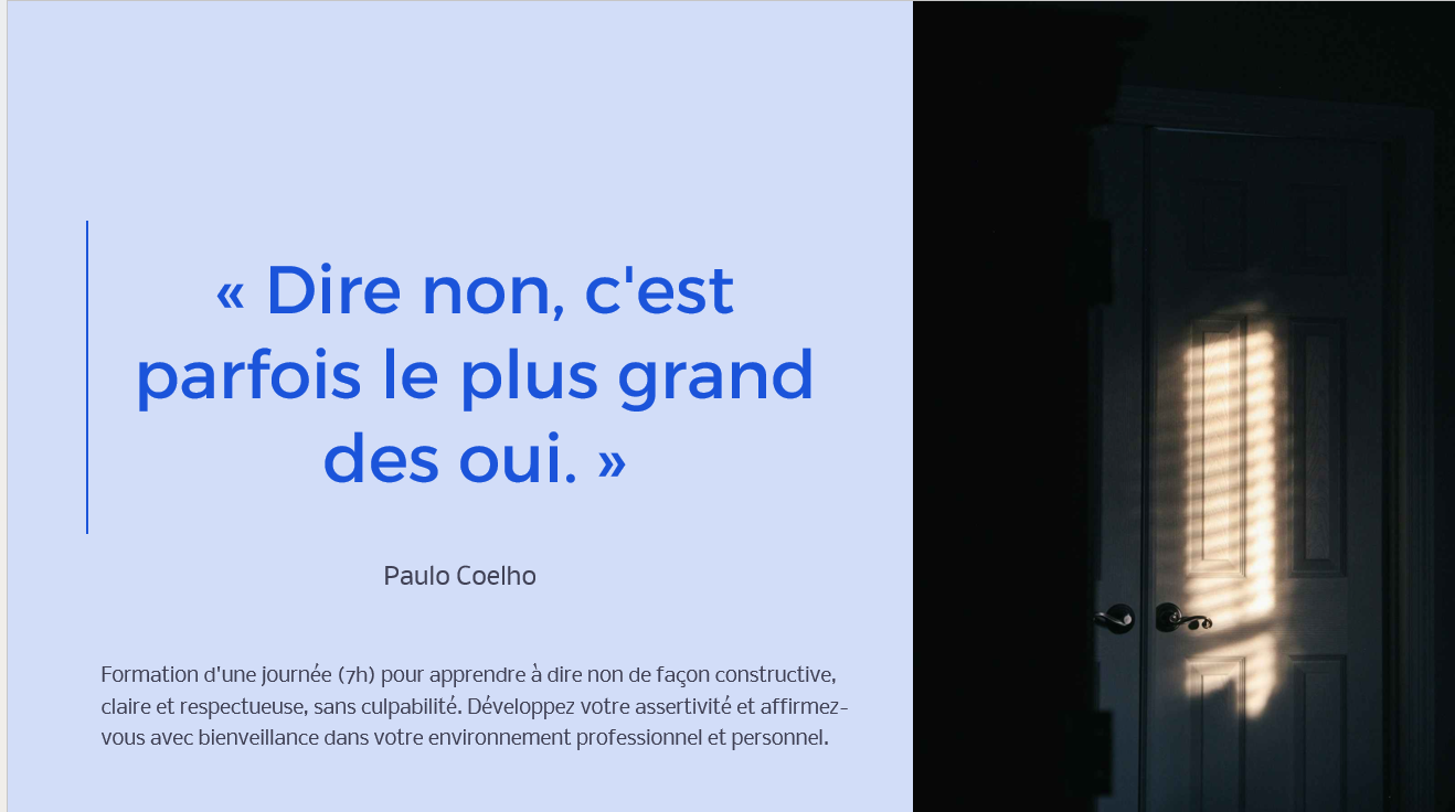 J’ai créé ce pack de formation « Développer son assertivité sans culpabiliser » pour aider les participants à apprendre à dire non avec clarté et bienveillance, sans se sentir coupables.