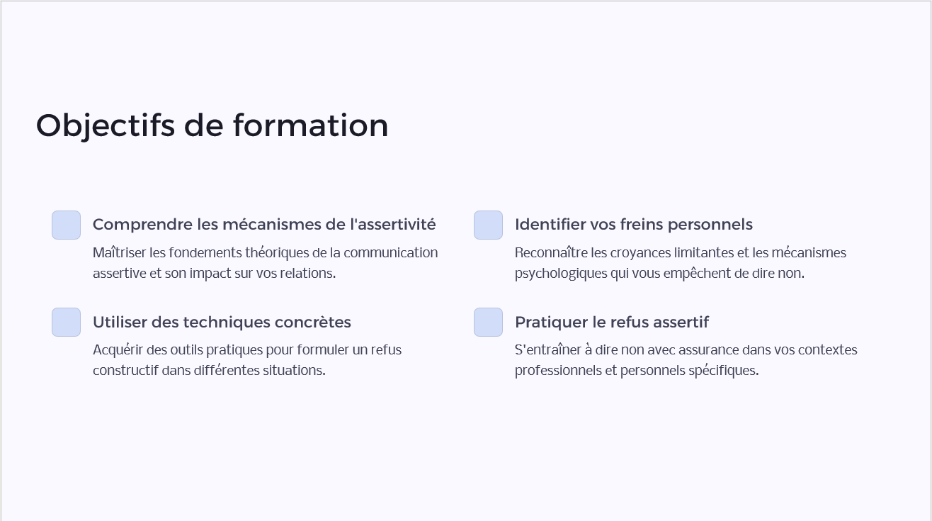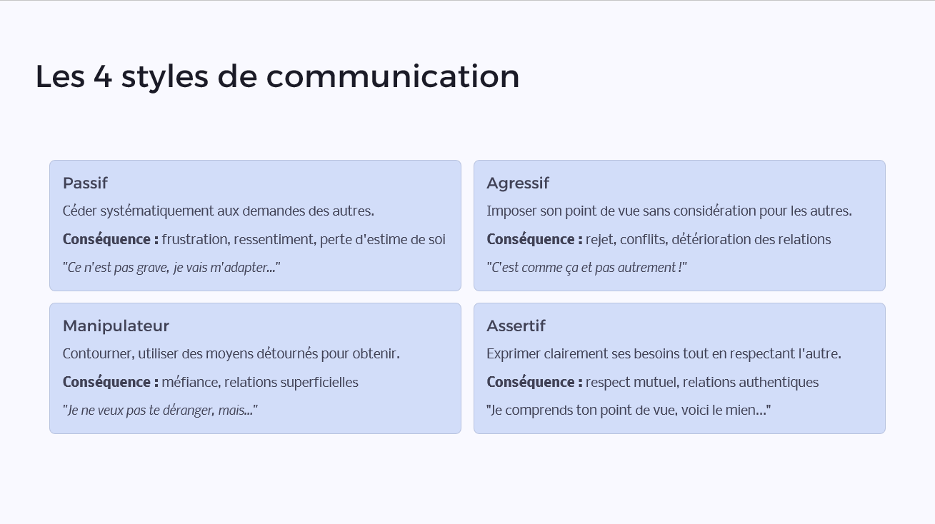 Comprendre ce qu’est l’assertivité, ses origines et ses différences avec les autres styles de communication (passif, agressif, manipulateur). - Chapitre 2 : Identifier ses freins