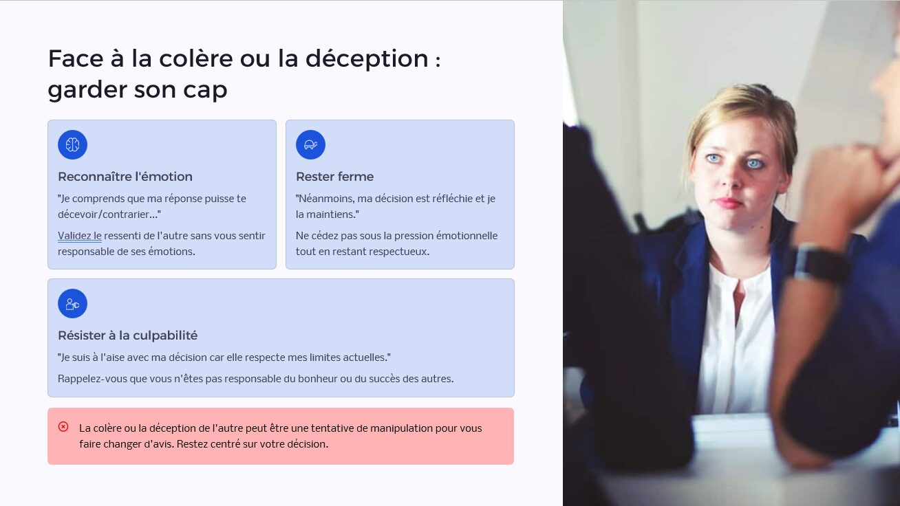 Faire face à l’insistance, à la colère ou à la déception, sans céder ni entrer en conflit. - Chapitre 6 : Pratiquer et ancrer l’assertivité