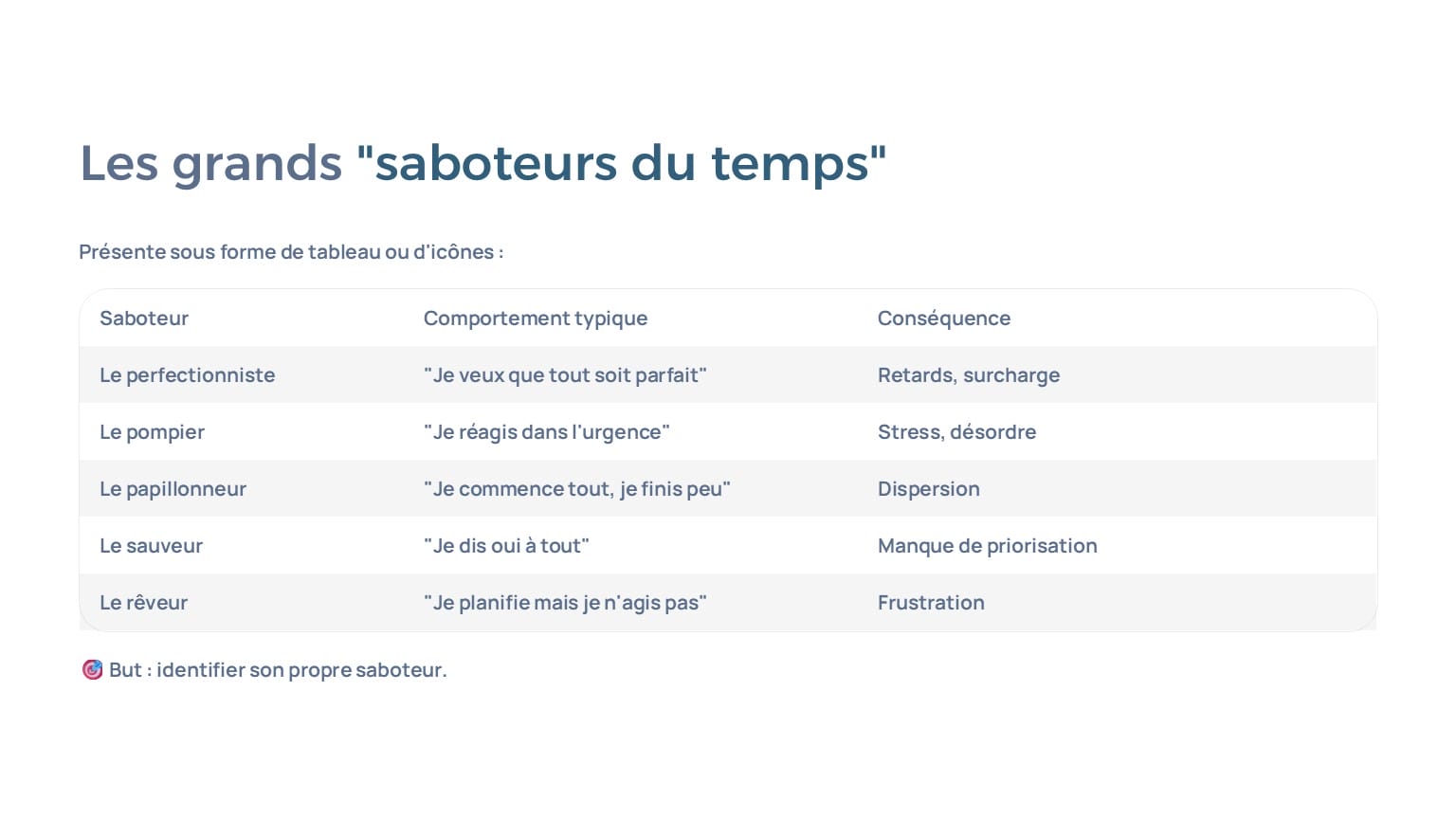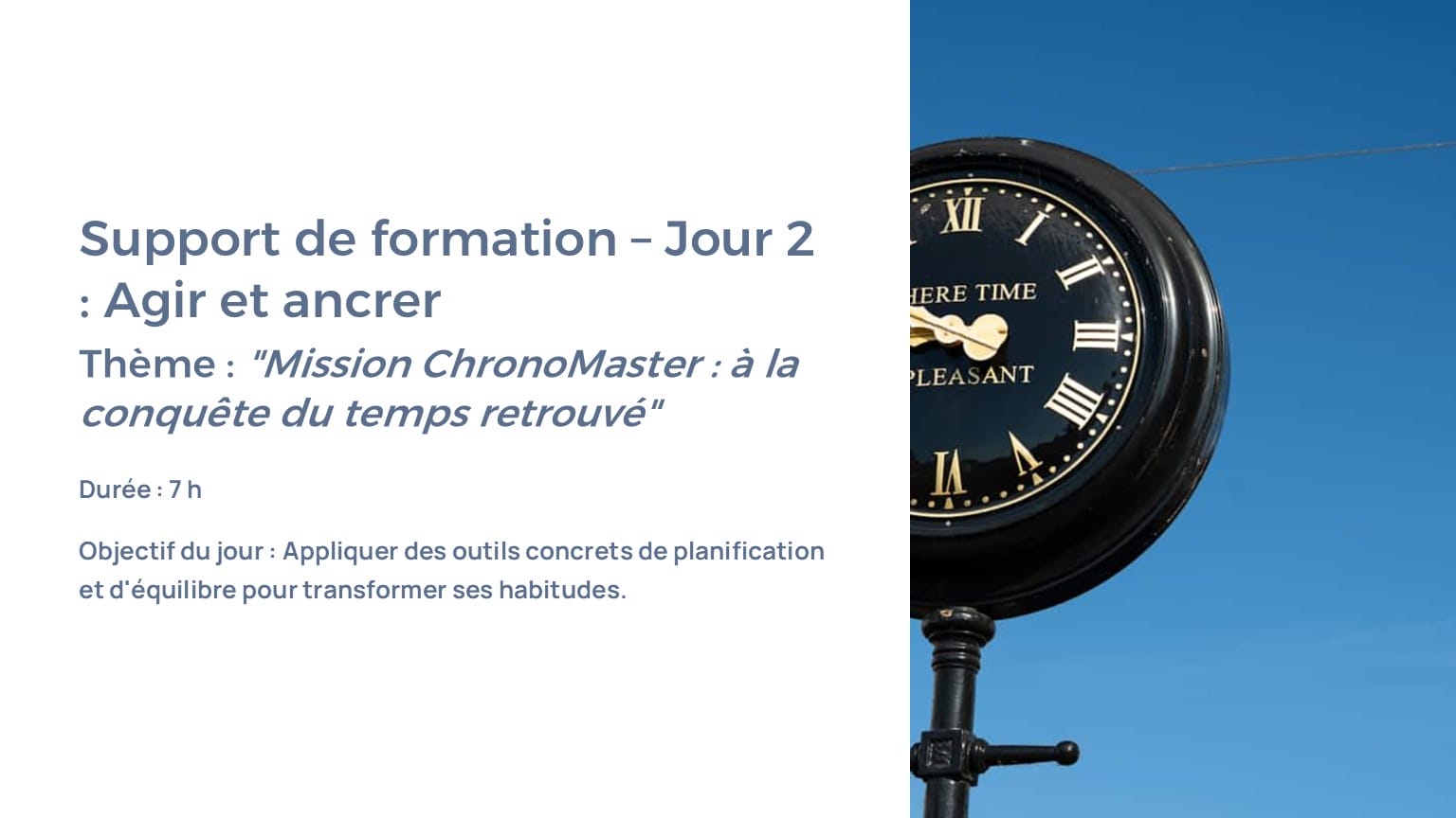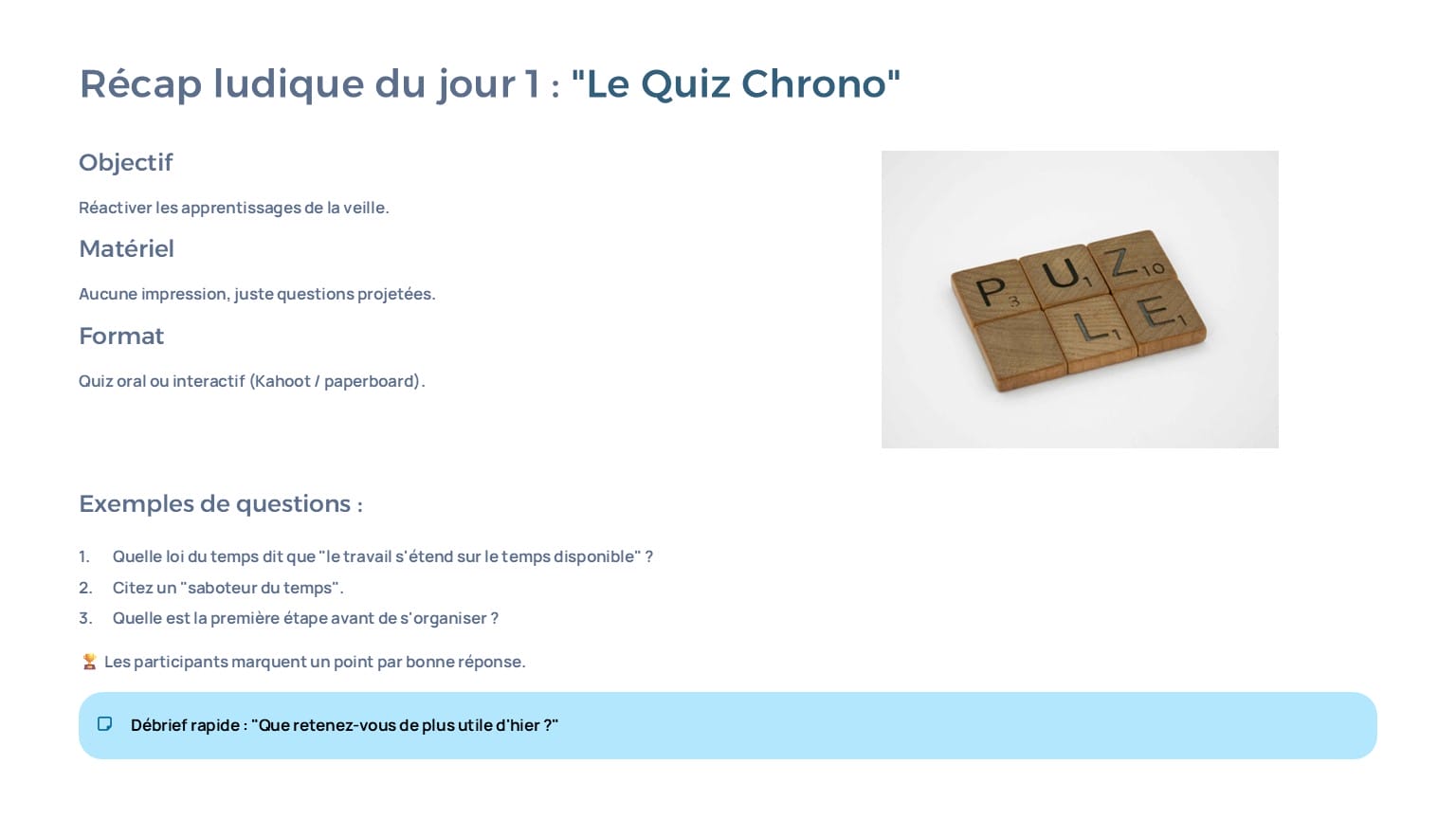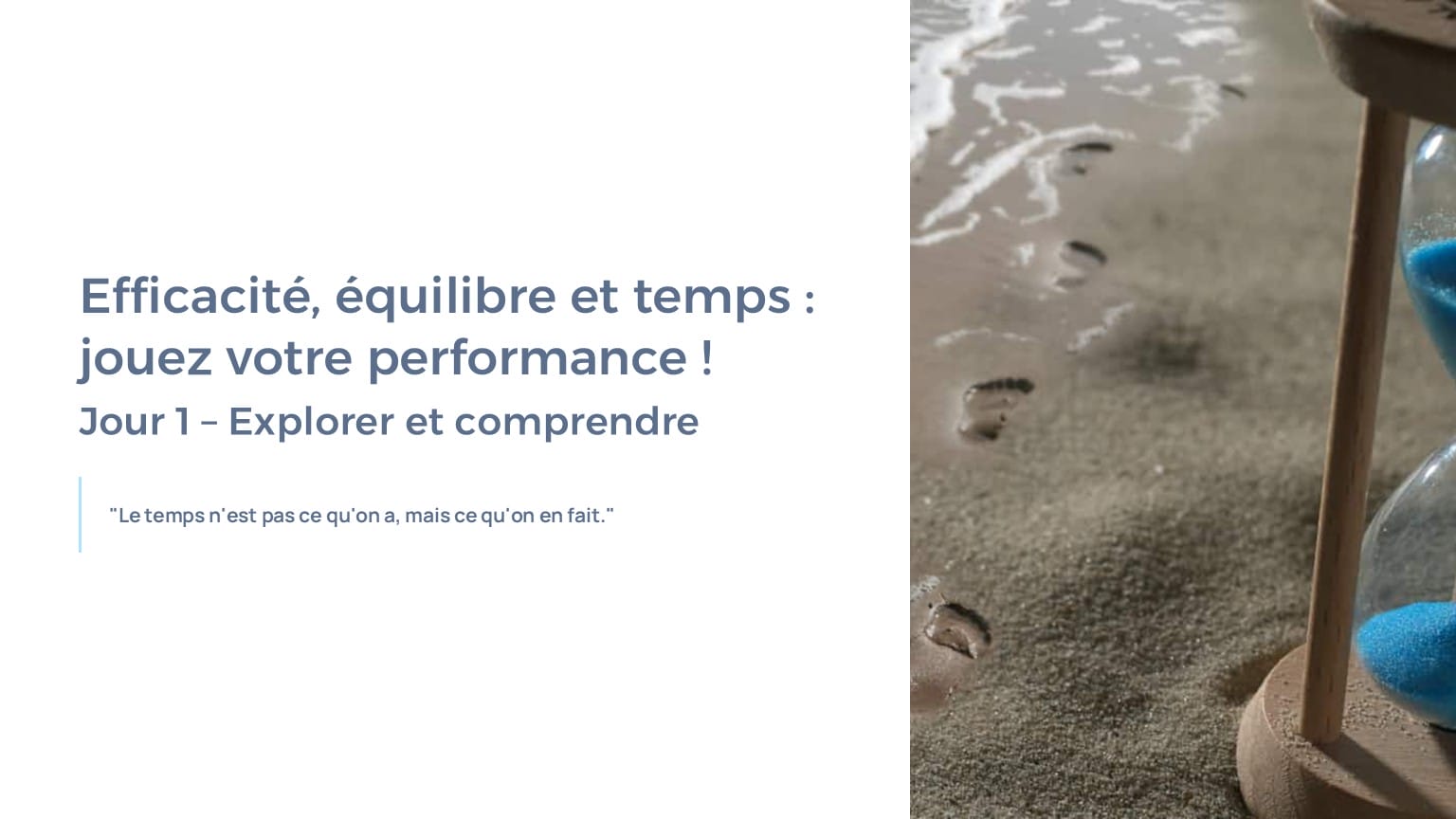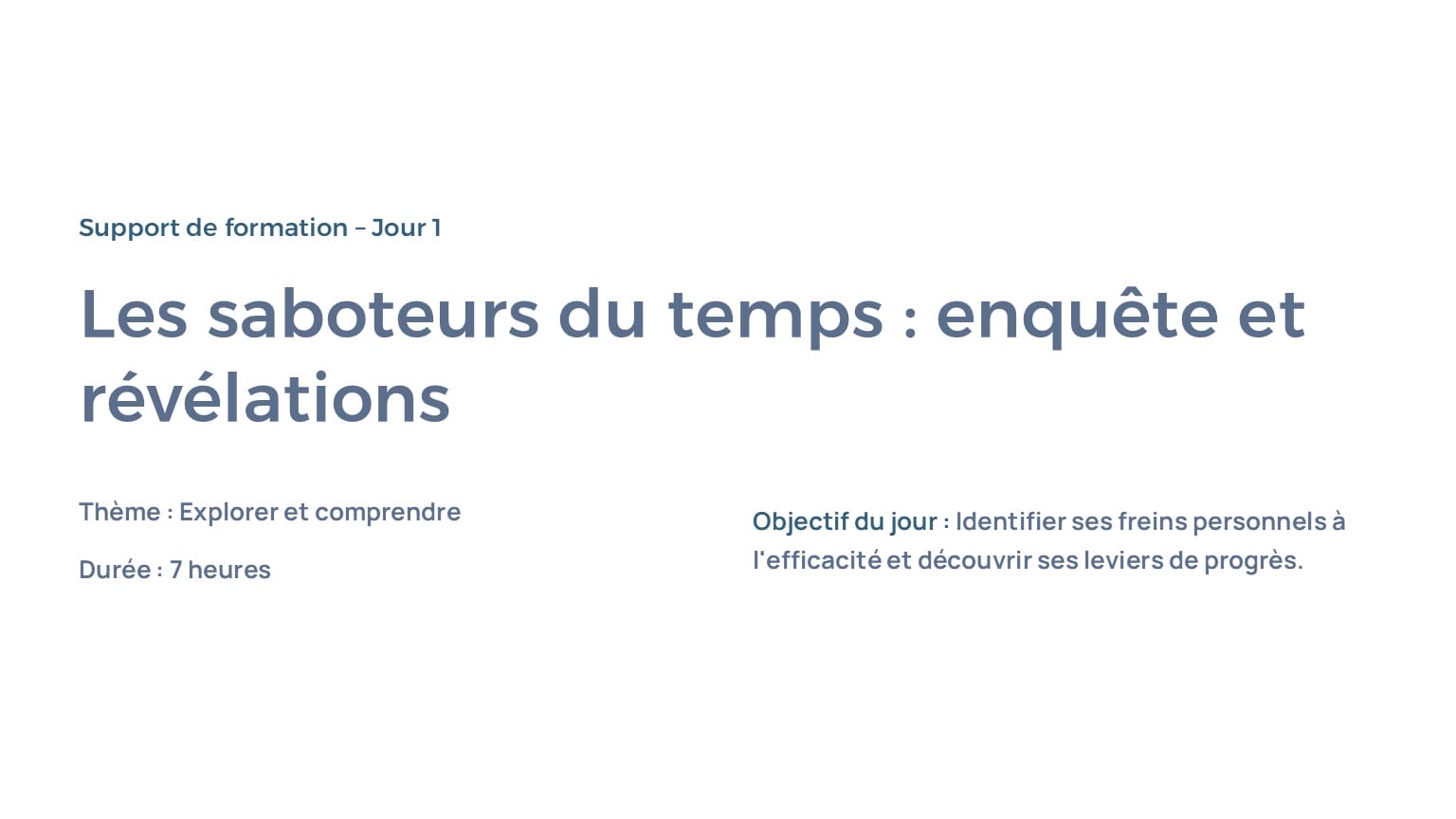 1 PPT Jour 1 (7 h) : saboteurs du temps, lois du temps, jeux de rôles, diagnostics, activités exploratoires.