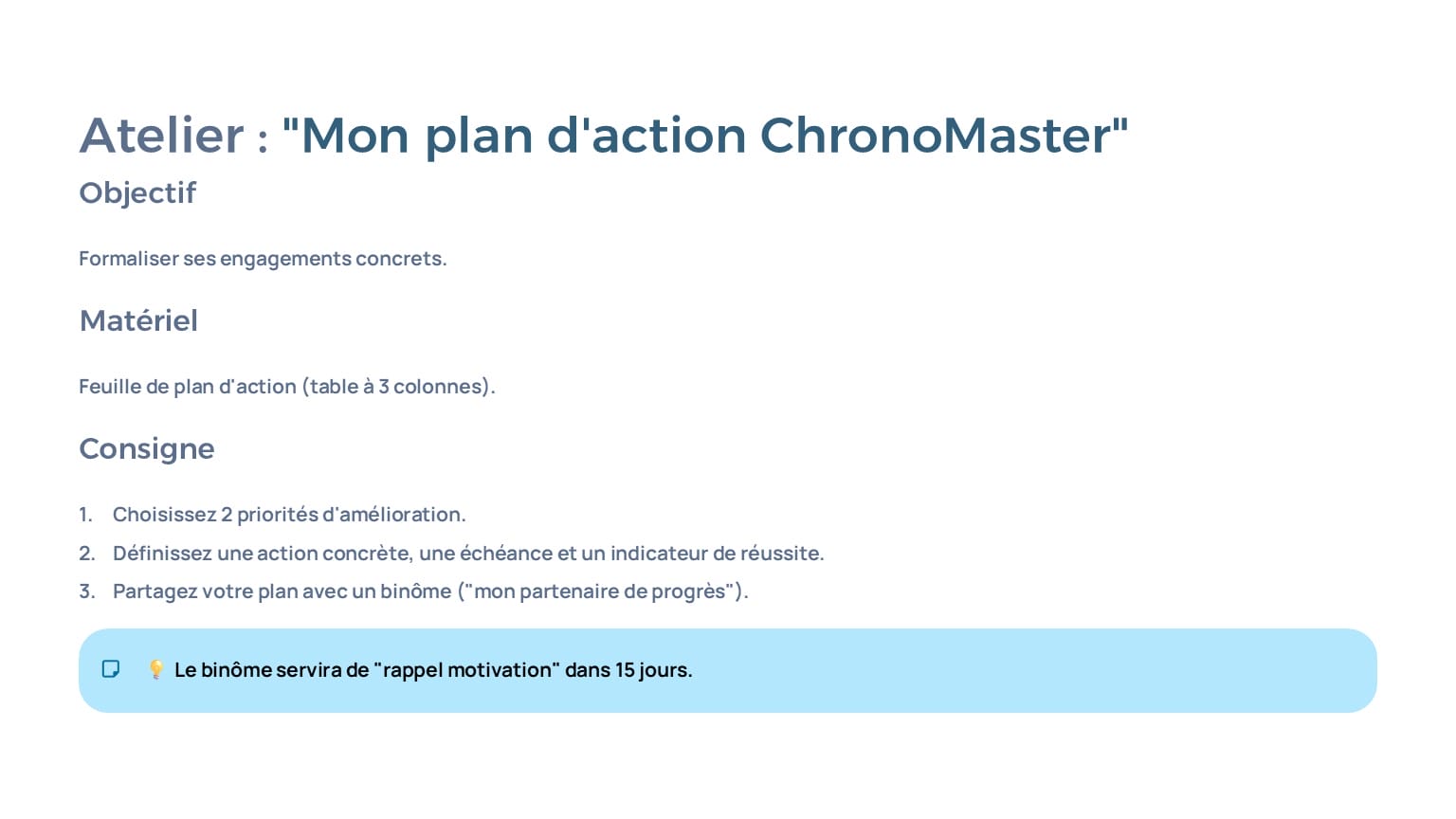1 PPT Jour 2 (7 h) : outils pratiques, priorisation, planification, gestion de l’énergie, plan d’action.