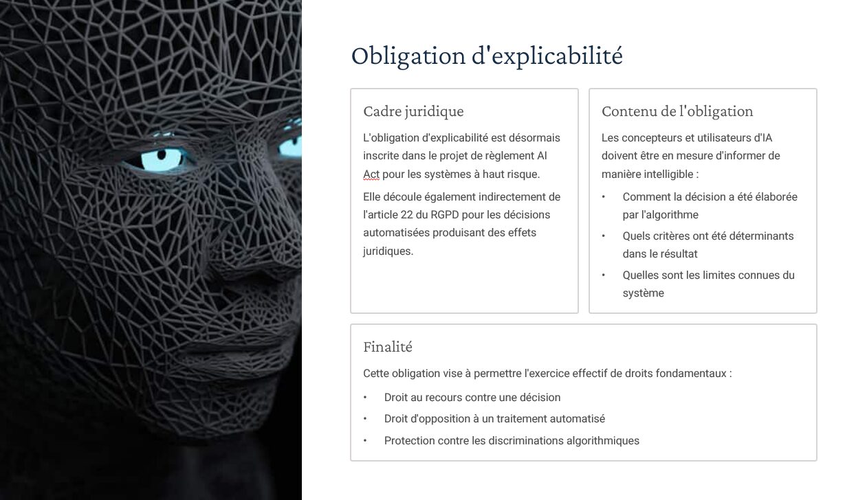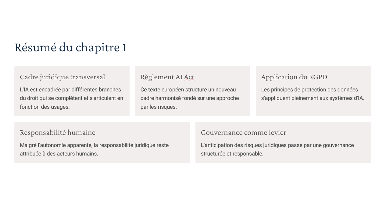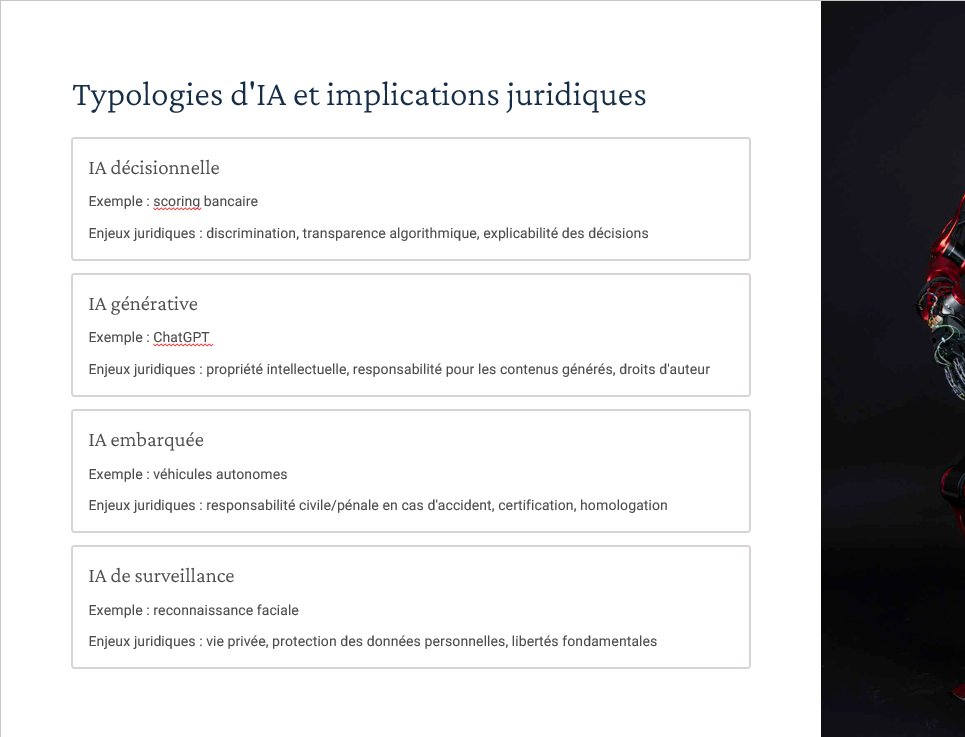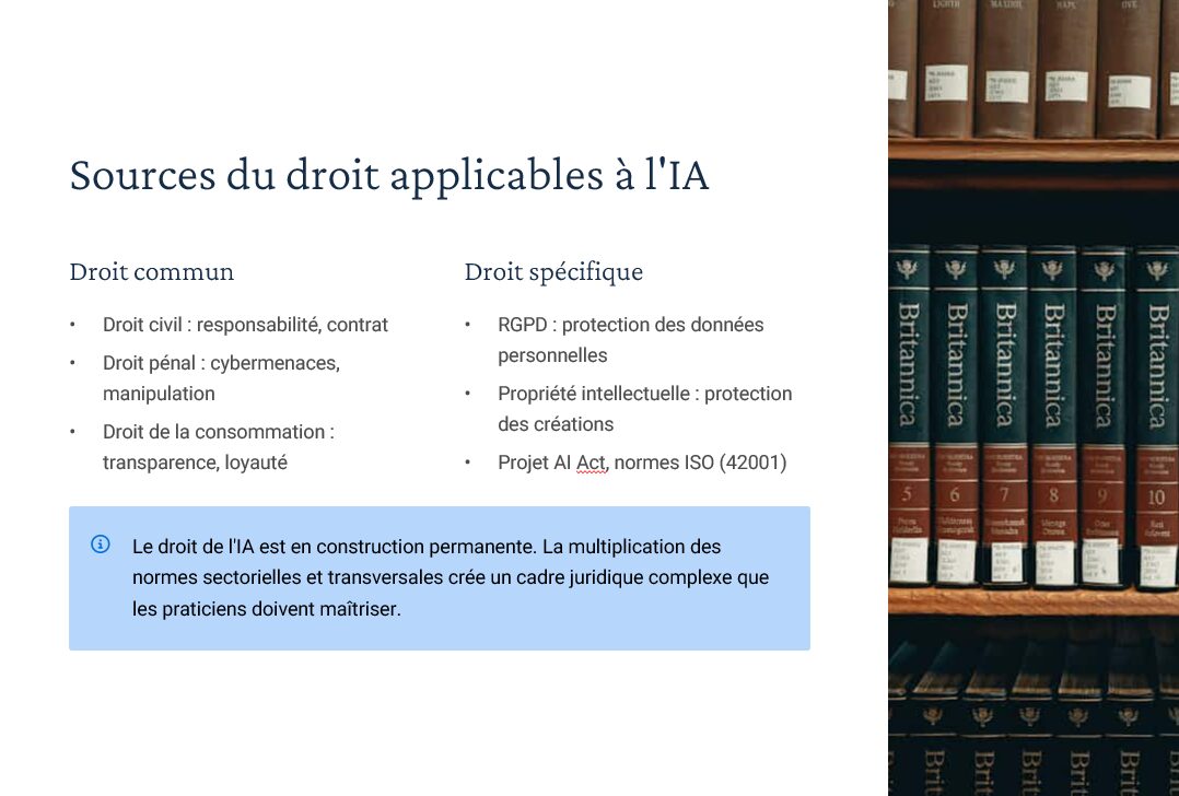 Un diaporama complet couvrant : définitions & typologies d’IA, AI Act (approche par niveaux de risque), RGPD (art. 22, AIPD), régimes de responsabilité (contractuelle, délictuelle, produit), gouvernance/explicabilité/transparence, propriété intellectuelle (droit d’auteur, secret des affaires, base de données), open source & licences. Inclus : “résumés de chapitres” utilisables comme check-lists en fin de séquence. -