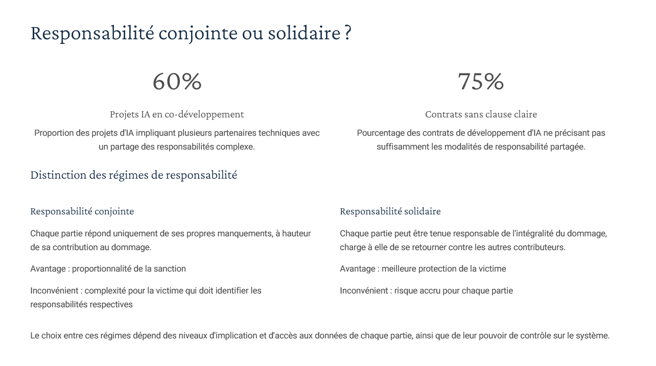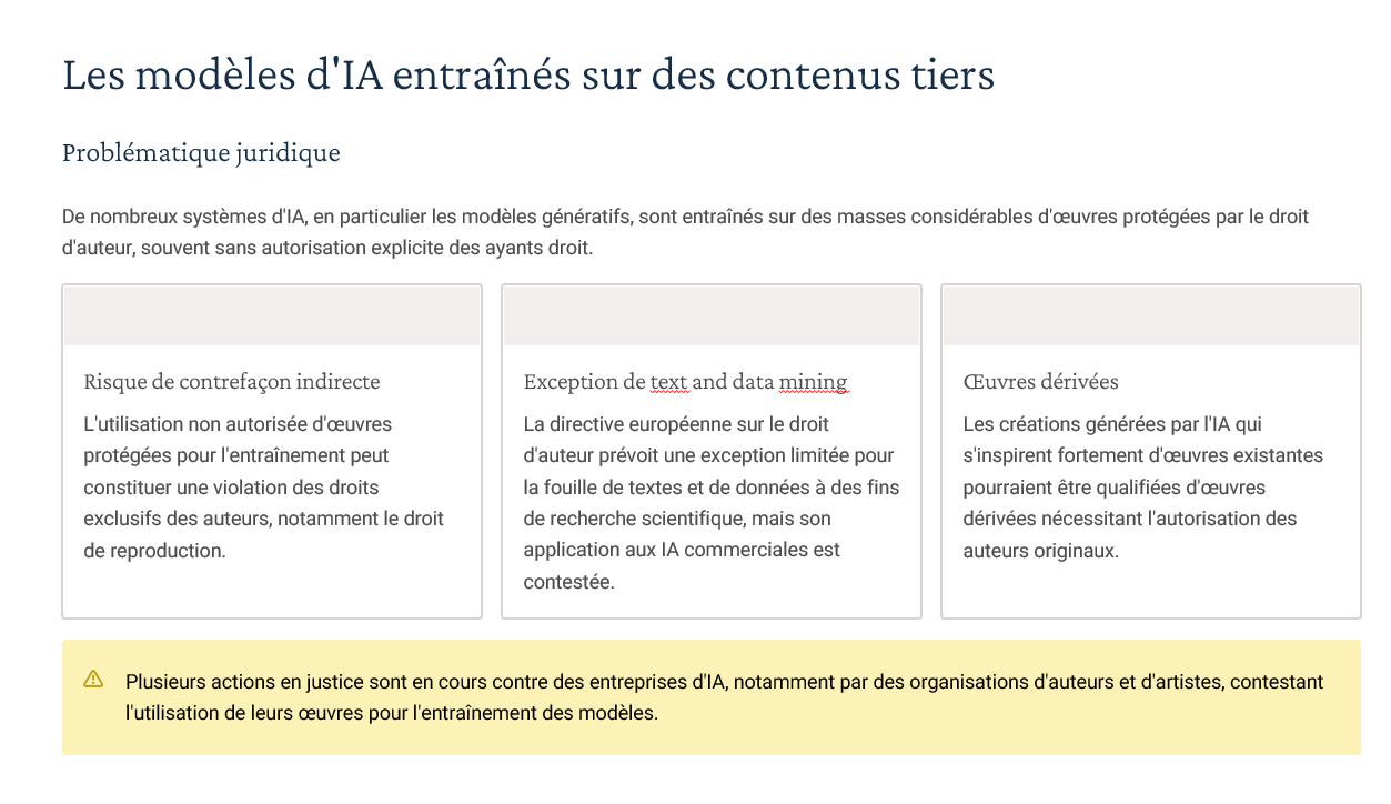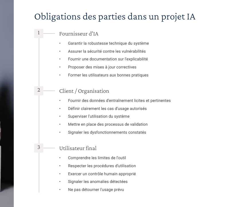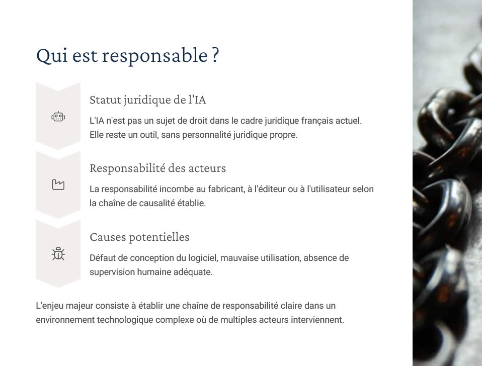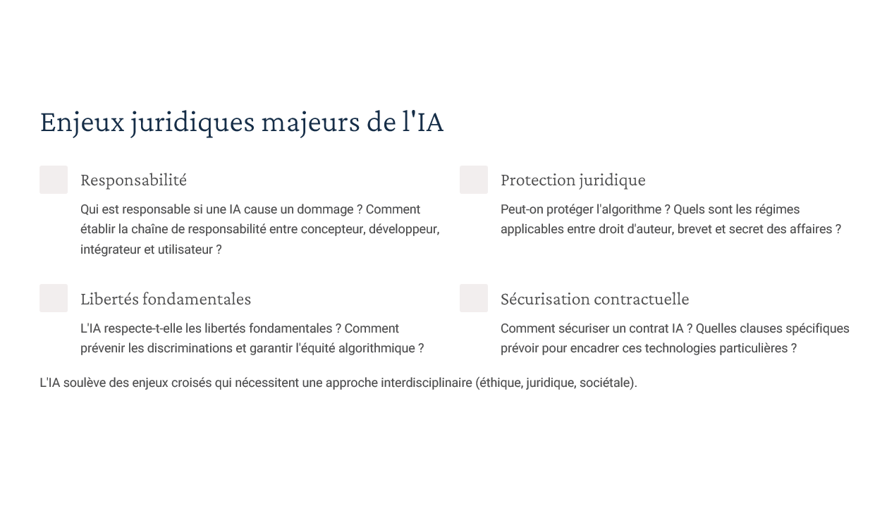 Un diaporama complet couvrant : définitions & typologies d’IA, AI Act (approche par niveaux de risque), RGPD (art. 22, AIPD), régimes de responsabilité (contractuelle, délictuelle, produit), gouvernance/explicabilité/transparence, propriété intellectuelle (droit d’auteur, secret des affaires, base de données), open source & licences. Inclus : “résumés de chapitres” utilisables comme check-lists en fin de séquence. -