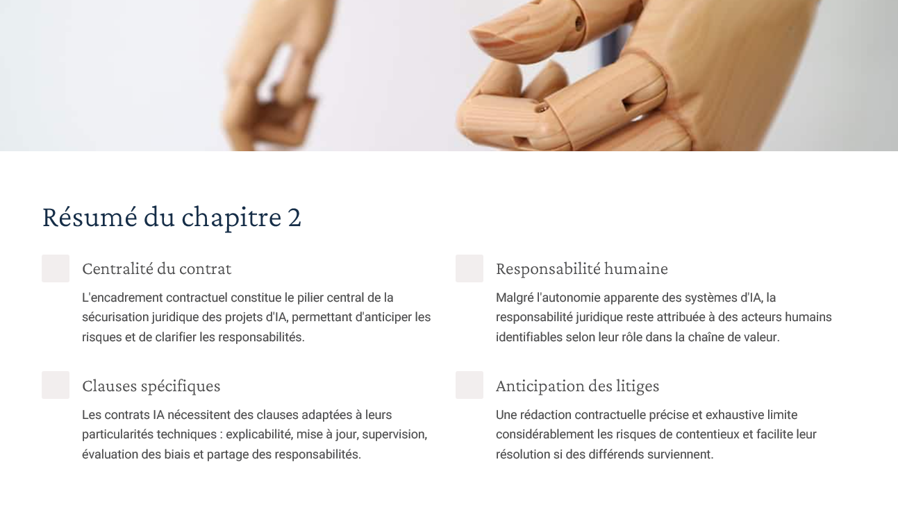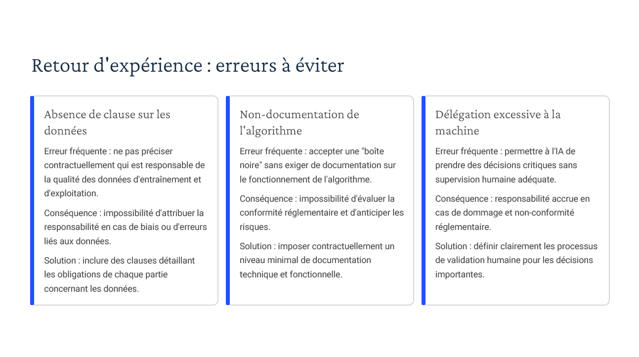 Transparence algorithmique, mise à jour continue, évaluation des biais, tests avant déploiement — modèles directement exploitables pour vos ateliers d’analyse de contrat. -