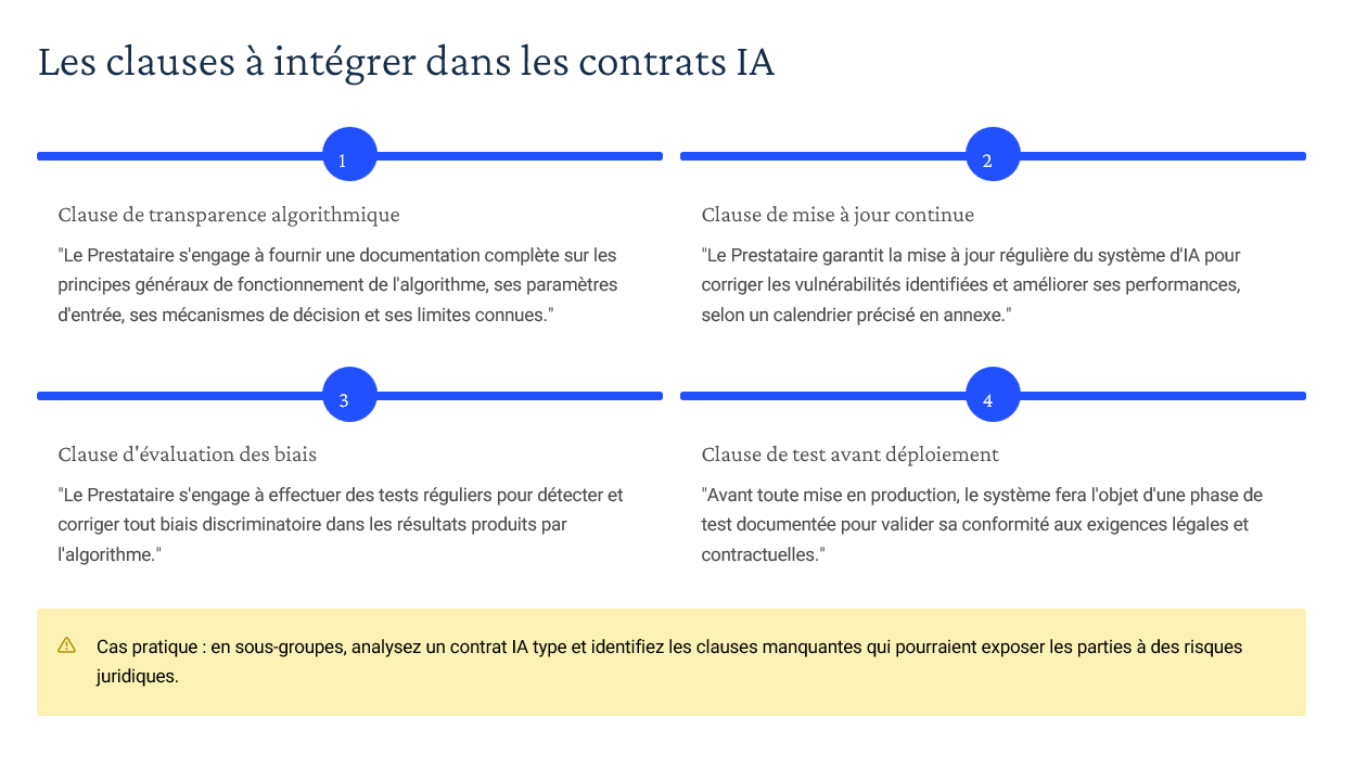 Des contrats types et clauses spécifiques à l’IA : vous avez sous la main des exemples concrets que vos stagiaires peuvent analyser, critiquer et améliorer.