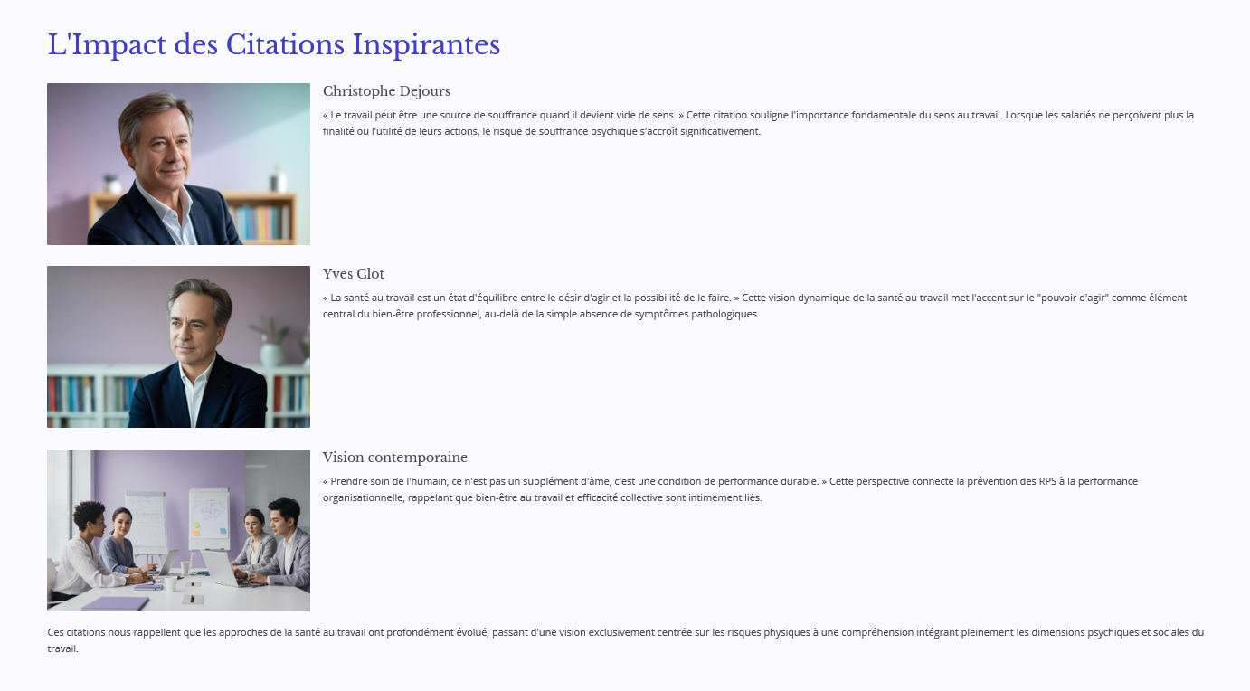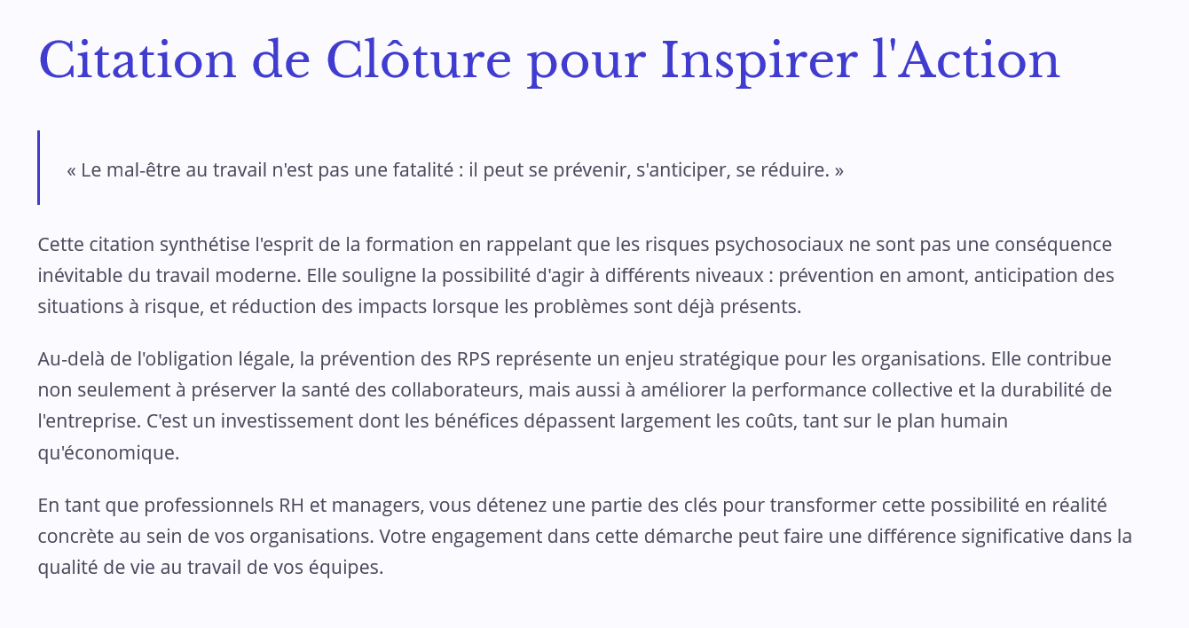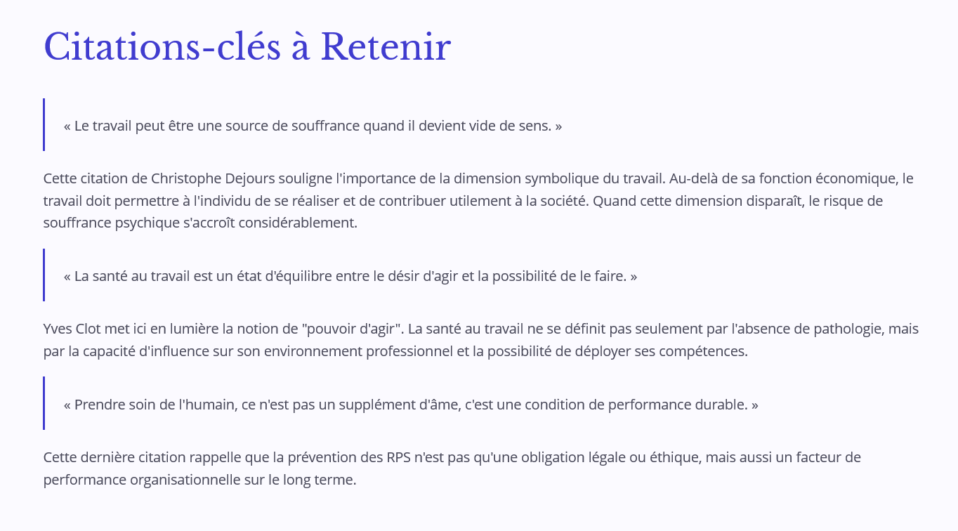 - 60 slides PowerPoint riches en contenu : définition des RPS, modèles explicatifs, cadre légal, études de cas, outils d’analyse, exercices d’ancrage, citations et bonnes pratiques.
