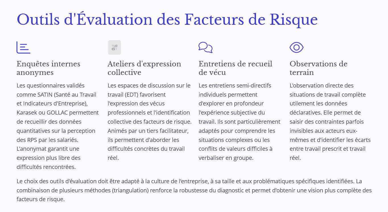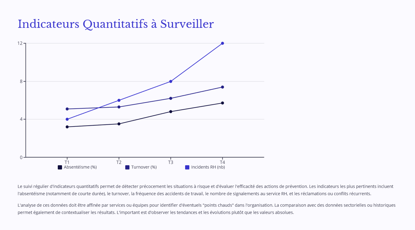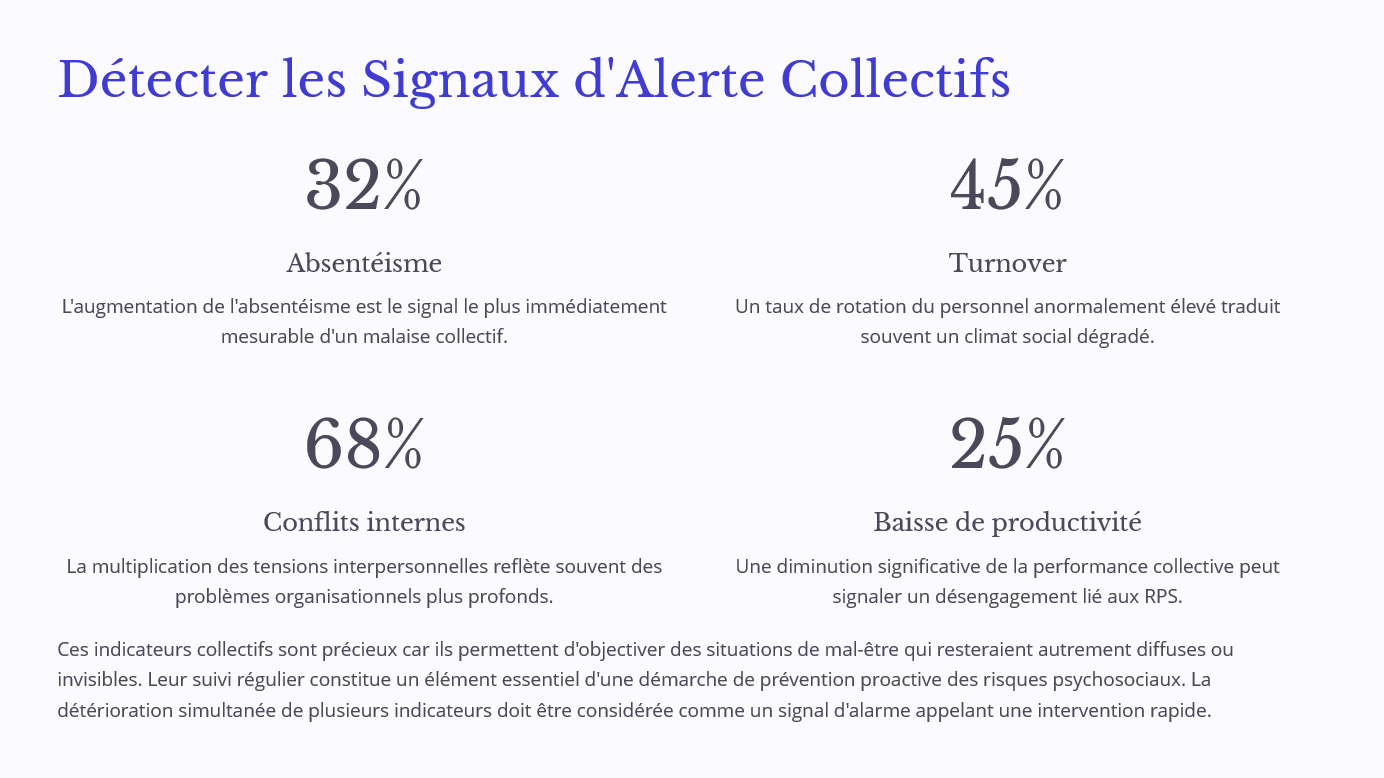 • Signaux organisationnels (absentéisme, conflits, turnover…).
