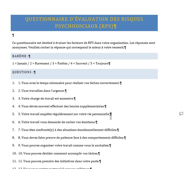 Un questionnaire d’auto-évaluation anonyme en word à remettre aux collaborateurs pour réaliser un premier diagnostic organisationnel, accompagné d’une grille d’analyse structurée par thématique.