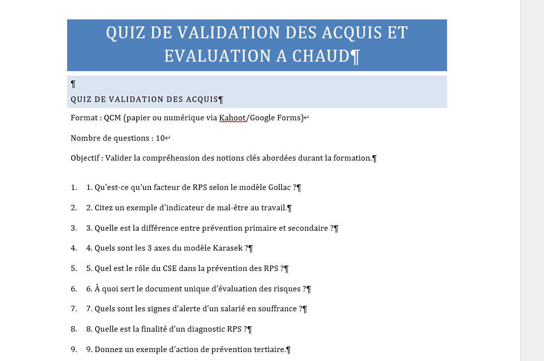Un quiz de validation des acquis en Word de 10 questions à utiliser en fin de session pour vérifier l’intégration des concepts clés.