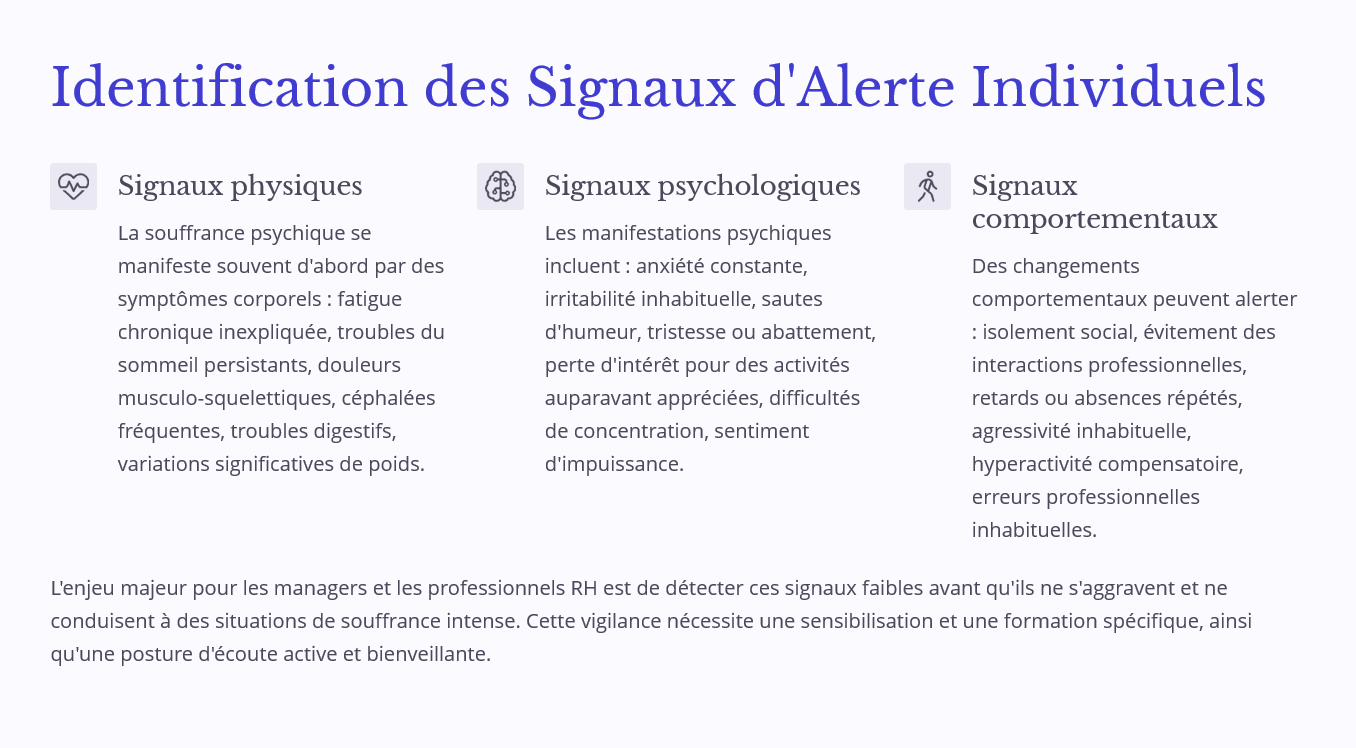 • Signaux individuels (physiques, psychologiques, comportementaux).