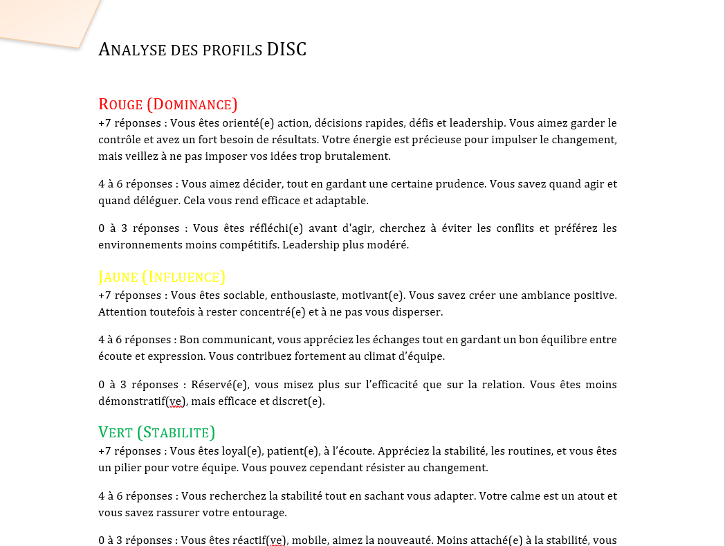 • Une grille de scoring simple à remplir, permettant de déterminer la dominante parmi les 4 couleurs du modèle DISC :
