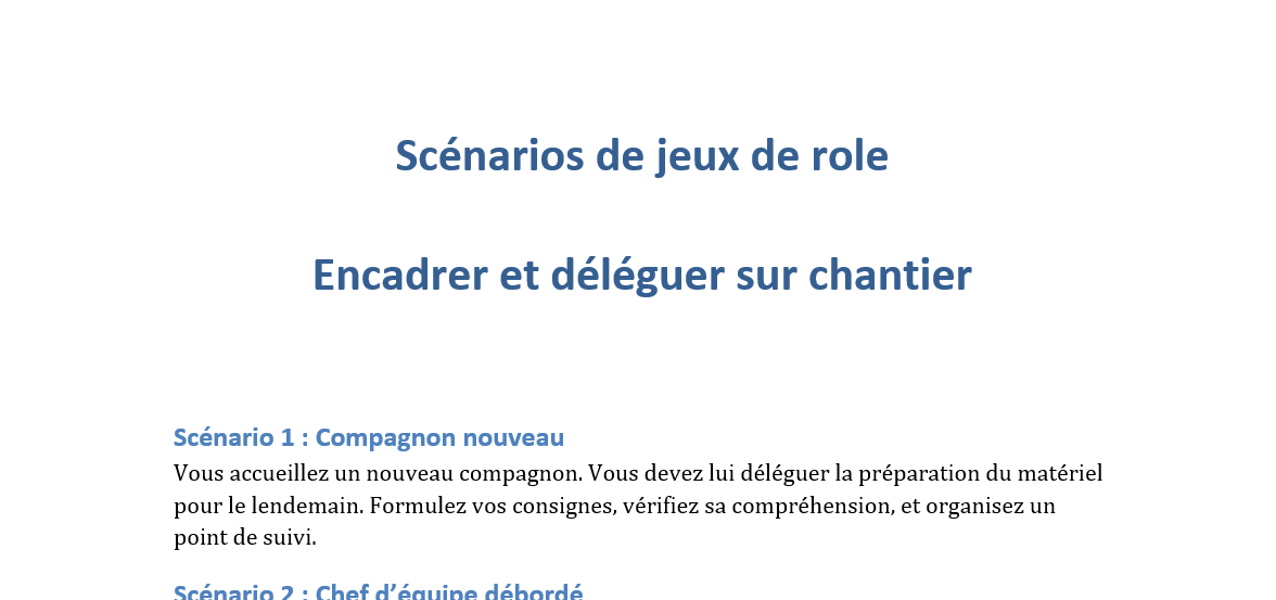 Trois scénarios de jeux de rôles réalistes directement liés au terrain (nouveau compagnon, chef d’équipe débordée, gestion d’une erreur).