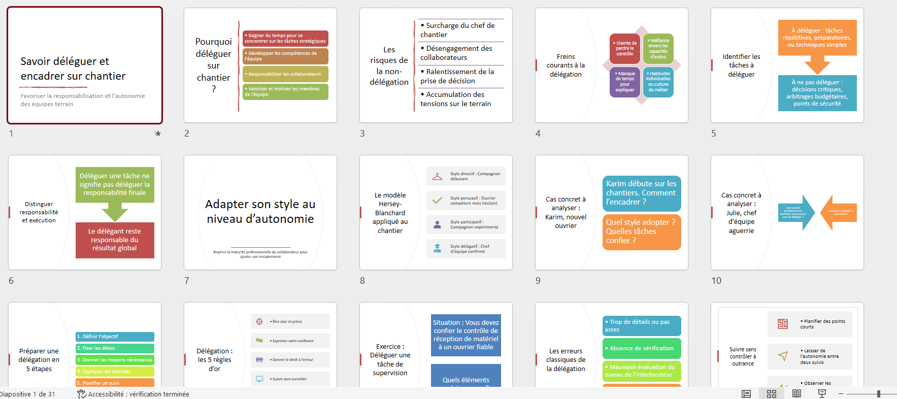 Le pack de formation « Savoir déléguer et encadrer sur chantier » est un outil prêt à l’emploi conçu pour les formateurs souhaitant proposer une session dynamique, concrète et immédiatement utile aux encadrants du BTP. Ce support pédagogique structuré sur une journée complète aborde tous les leviers du management opérationnel sur chantier, avec un focus particulier sur la responsabilisation des équipes terrain.