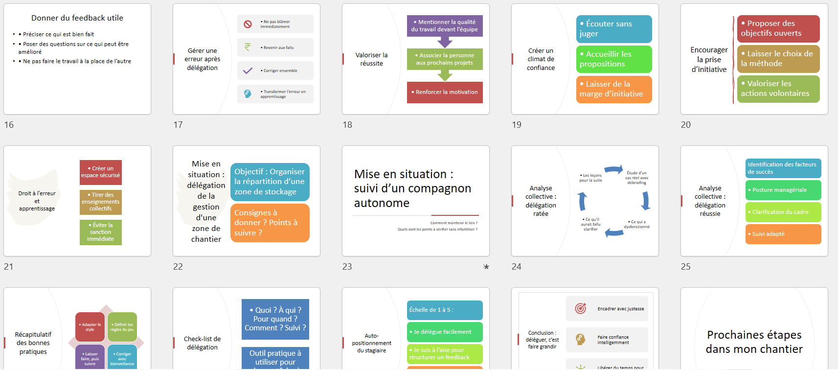 Un diaporama PowerPoint professionnel et enrichi avec contenus théoriques, apports pédagogiques, modèles et check-lists utilisables en situation réelle.
